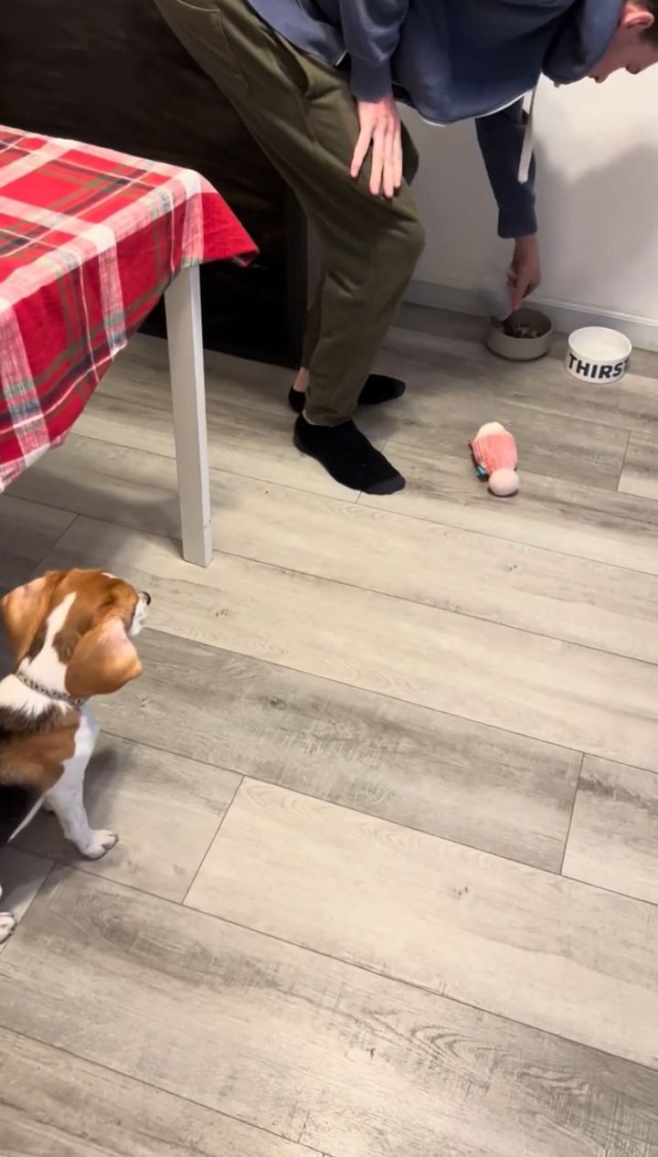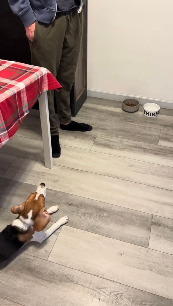 ごはんの前に「お座り」と「伏せ」で待つ訓練を受けるビーグルの子犬。 パパさんの指示に従って、じっと我慢している・・・ように見えましたが??