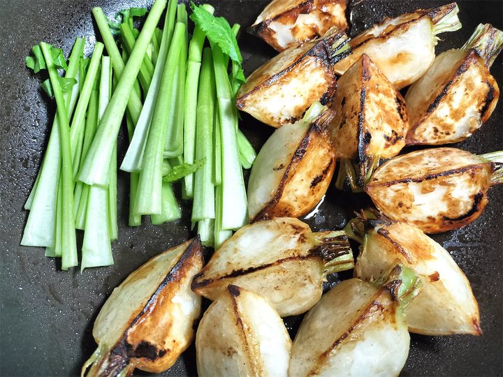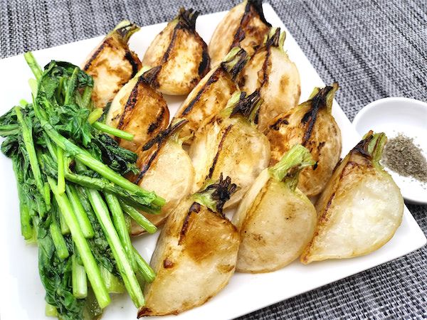 まさに焼いただけのかぶですが、焼いた面のこんがり食感と内側のホクホク食感が結構クセになります。焼きたては熱々で香りもよく、焼き芋などとはまた違う、水分を多く含んだかぶならではのおいしさでした。この料理では葉や茎も焼いて一緒に食べてしまいますが、かぶ本体の甘さとは違ったおいしい苦みと少し歯ごたえのある食感のバランスがとてもよいです。元気な葉のついているかぶが手に入ったら、ぜひまた作ってみたいと思うほどです。