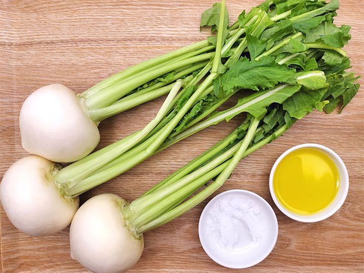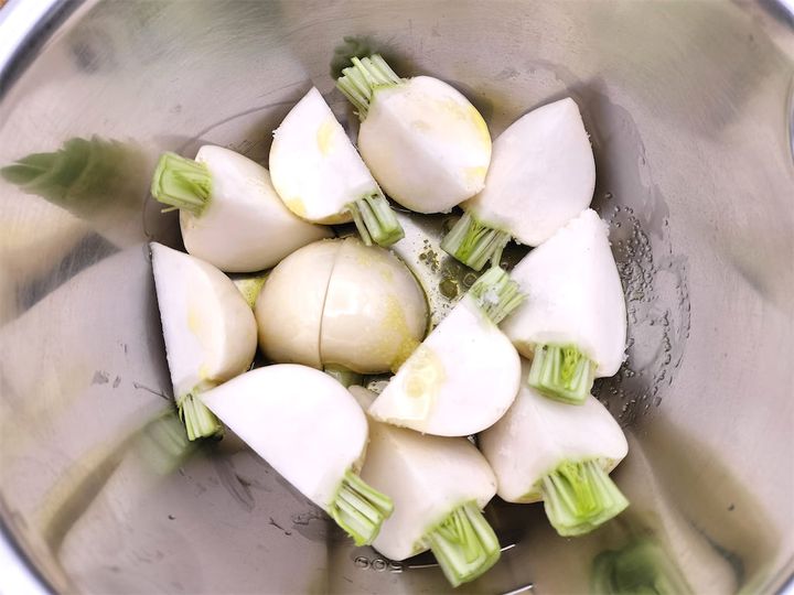 1.  ボウルにかぶ、塩、オリーブオイルを入れ、よく混ぜてマリネしておきます。