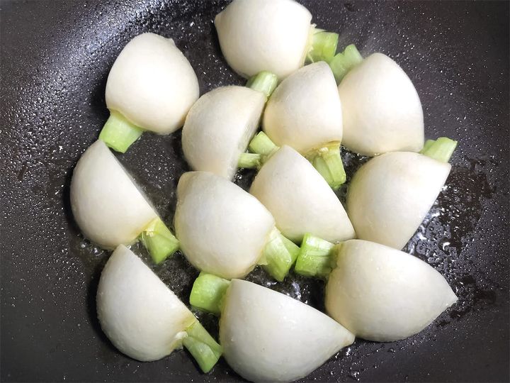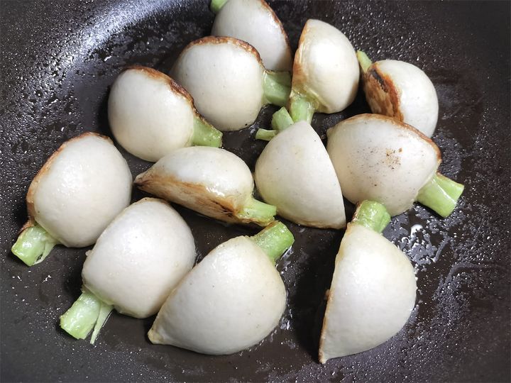 2.  フライパンにかぶを並べ、マリネしたオリーブオイルも一緒に入れて強火にかけ、オリーブオイルが少しぶくぶくしてきたら強めの中火にして、そのまま触らずに約5分ほどじっくりとこんがり焼きます。