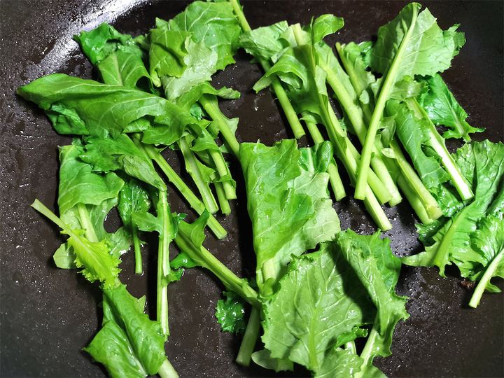 5.  かぶと茎を器に盛り、空いたフライパンに広げた葉を入れ、残ったオイルで中火で焼きます。