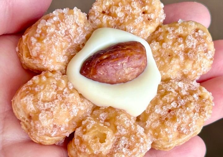 パイの中央には、クリームとアーモンド。バターの風味たっぷりのシンプルなパイ生地に、甘くしっとりとしたクリームと、カリッとしたアーモンドがよいアクセントになっています。