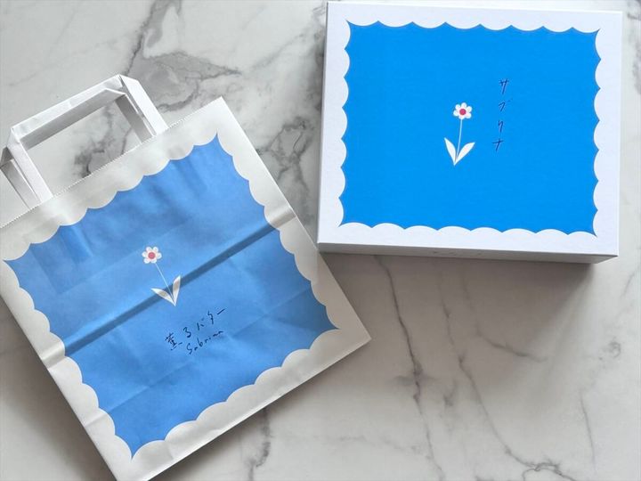 商品を購入すると、箱と同じデザインの紙袋に入れてもらえます。鮮やかなブルーに、中央に白いお花がちょこんとあしらわれたシンプルなデザインが可愛らしいですよね。