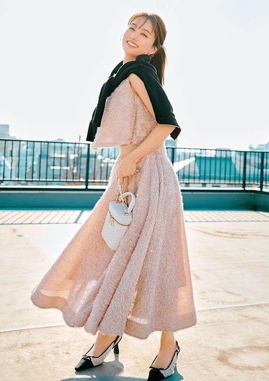 シャギートップス¥16,500、シャギースカート¥39,600、肩に巻いたニットジャケット¥16,500/以上JENNE(JENNE 表参道店) ピアス¥5,610、リング¥4,620/ともにフル・オブ・グレイス(ズットホリック) バッグ¥8,910、パンプス¥8,910/ともにRANDA