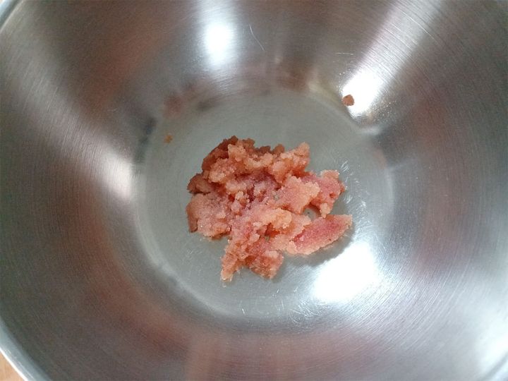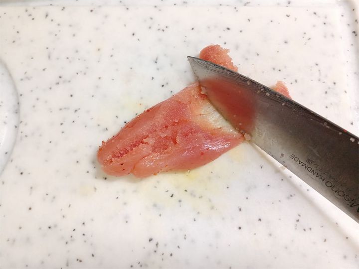 2包丁で明太子の皮に切れ目を入れ、ボウルに入れてほぐしておく。