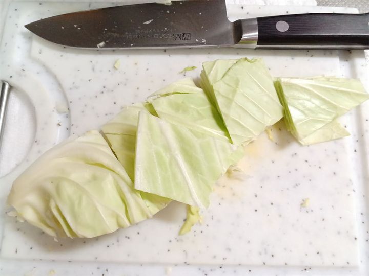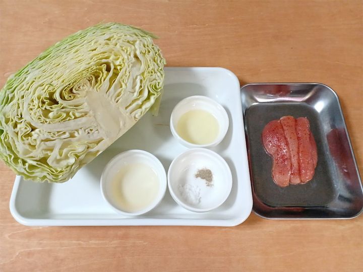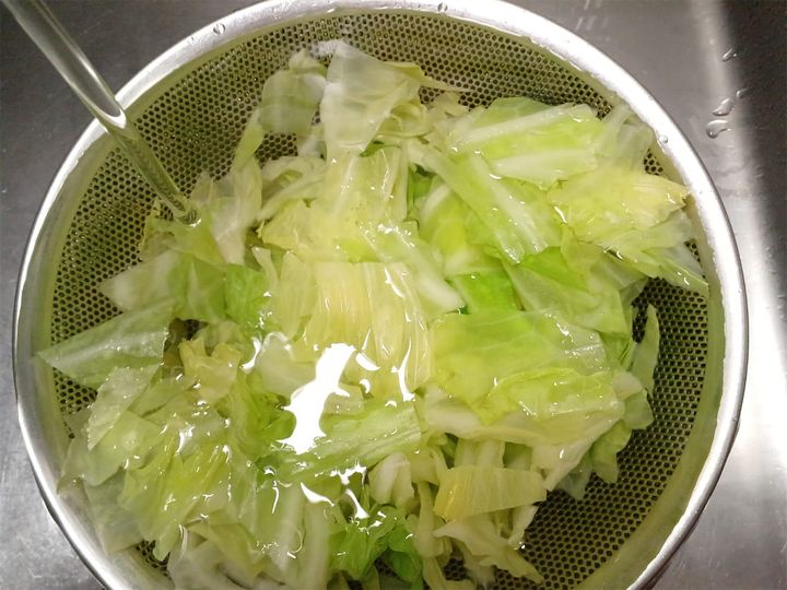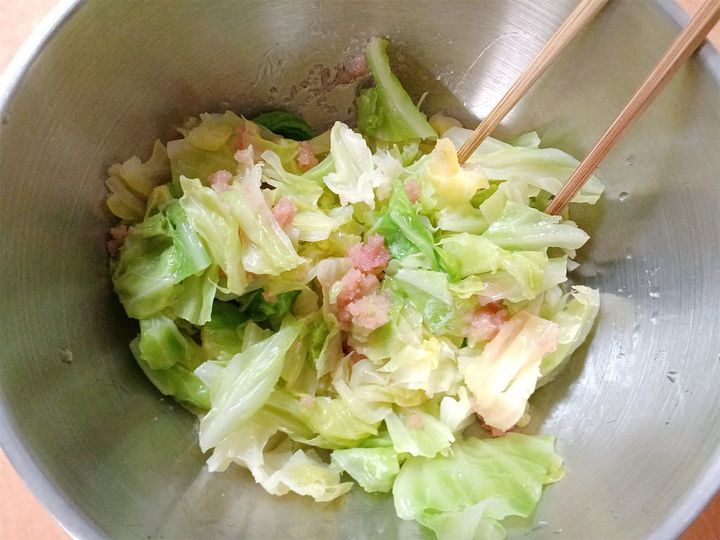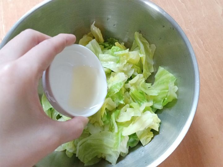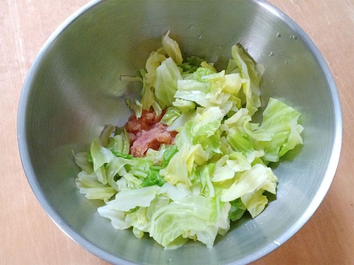 1.キャベツの芯を取り適度な大きさに切って、しんなりするまで茹でる。茹で上がったら冷水につけ、ザルに上げて水気をきる。
