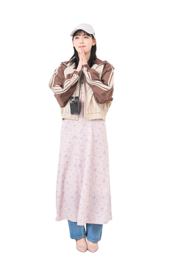 ジャケットは着回し。小花柄ワンピース 16,940円/SNIDEL デニムパンツ 6,589円/ROPÉ PICNIC(ジュン) キャップ 4,400円/ニューエラ バッグ 4,700円/MORE self LOVE パンプス 18,700円/ダイアナ(ダイアナ 銀座本店)