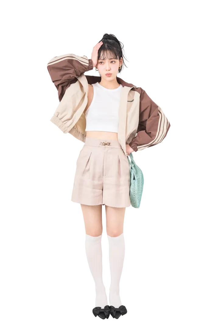 ジャケットは着回し。クロップド丈タンクトップ 1,090円/ZARA(ザラ) ベージュショートパンツ 7,590円/dazzlin イヤリング 4,620円/ミミサンジュウサン(サンポークリエイト) バッグ 7,700円/キャセリーニ ソックス 1,540円/靴下屋(Tabio) ミュール 7,900円/MORE self LOVE