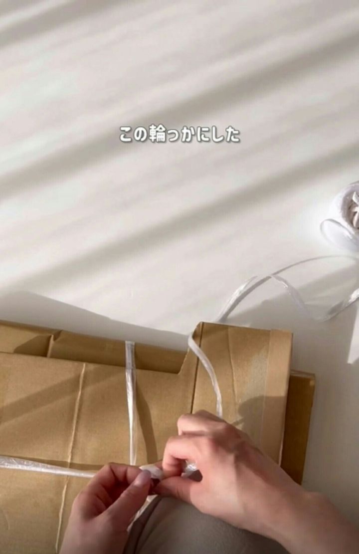 段ボールなどをいつも通りにまとめ、くくる前に長い方のひもで輪を作ります。