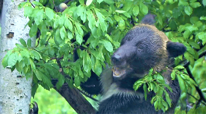2019年、札幌・南区の住宅の庭で、木に登りリンゴを食べるクマ