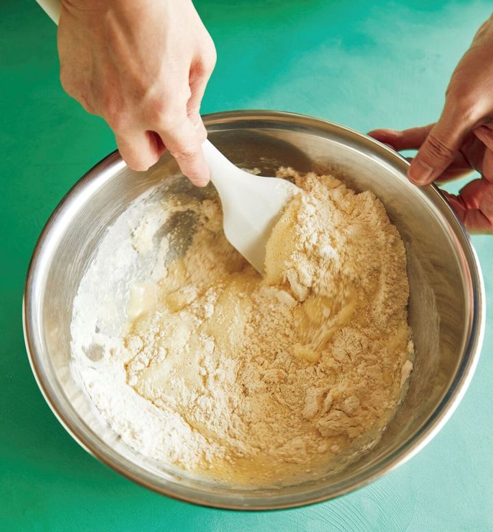 ボールに薄力粉をふるい入れる。残りの粉類の材料を加え、ゴムべらでざっと混ぜて均一にする。別のボールに液体の材料を入れ、泡立て器で勢いよく混ぜてなじませる。粉類のボールに加え、ゴムべらでさっくりと混ぜて半分くらいなじませる。