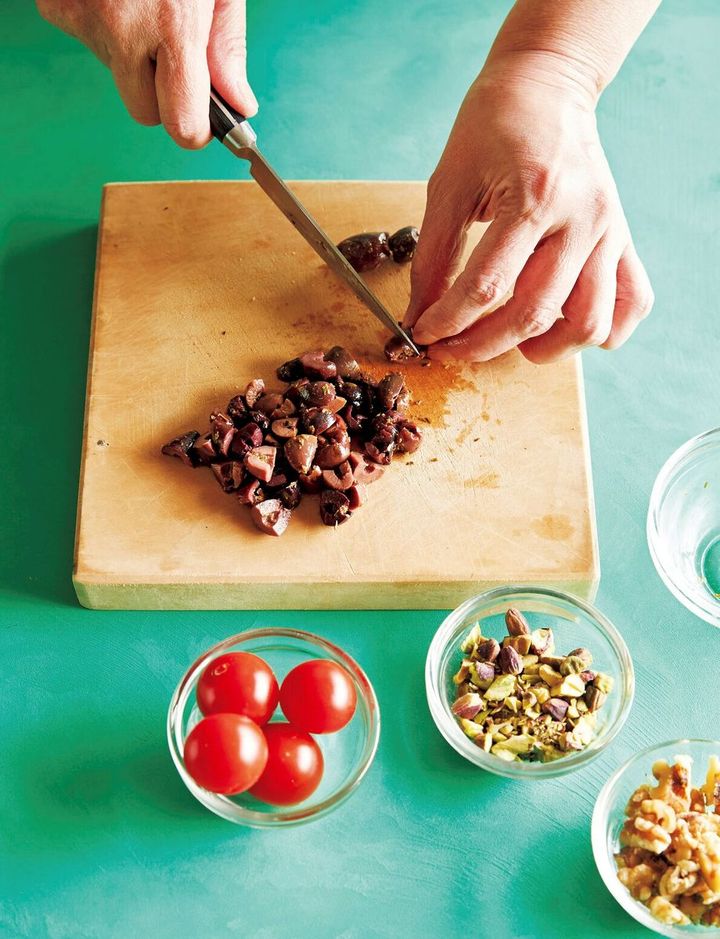 くるみ、ピスタチオ、オリーブはそれぞれ粗く刻む。ミニトマトはへたを取り、縦半分に切る。