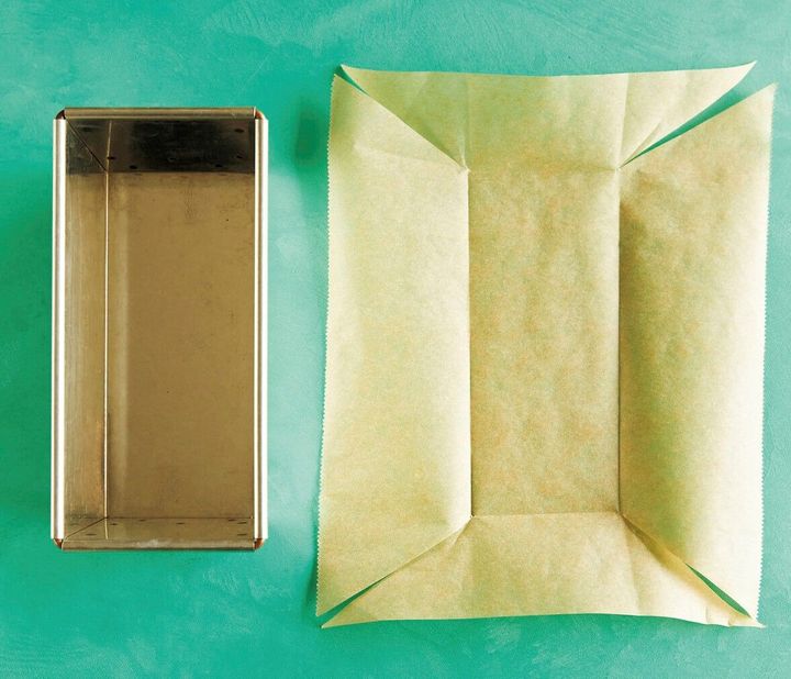 ・オーブン用シートを型よりひとまわり大きく切り、底に合わせて折り目を入れ、四隅に切り込みを入れて型に敷く。