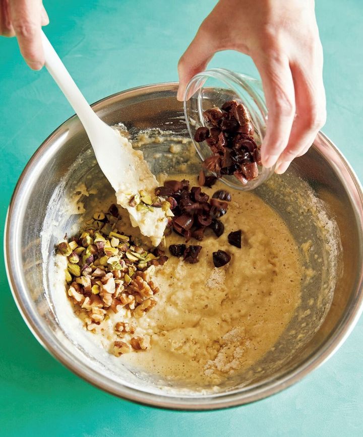 粉けがまだ残っているうちに、くるみ、ピスタチオ、オリーブを加え、ゴムべらでさっくりと混ぜる。