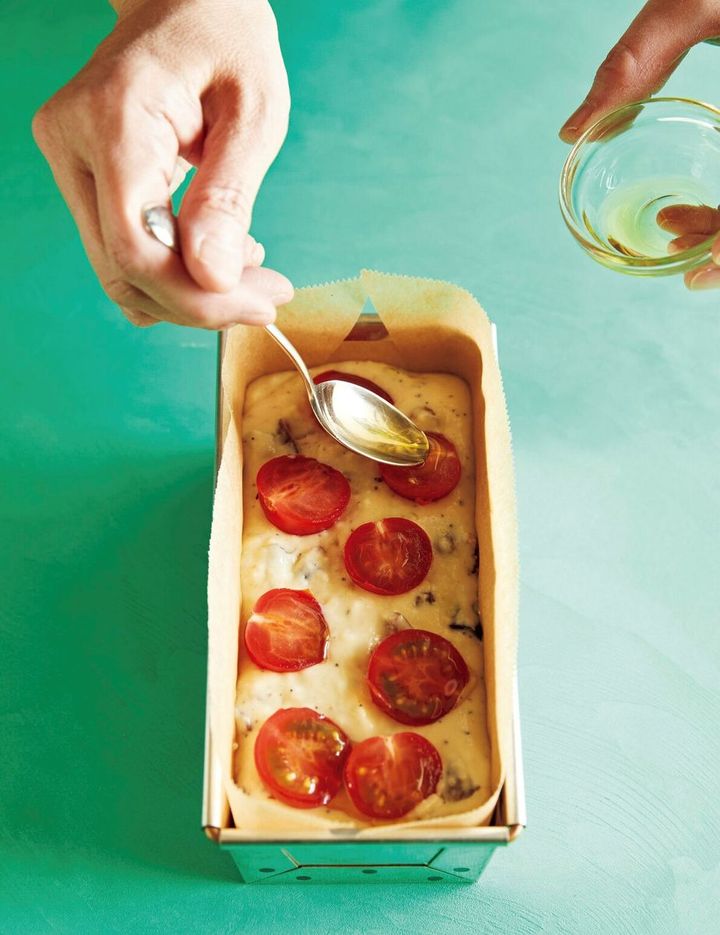 下準備した型に生地を入れる。ミニトマトをバランスよく並べ、仕上げ用のオリーブオイルをミニトマトにかける。天板にのせてオーブンの下段に入れ、180℃で30分ほど焼く。竹串を刺してみて、生っぽい生地がついてこなければ焼き上がり。取り出して型からはずし、粗熱を取る。