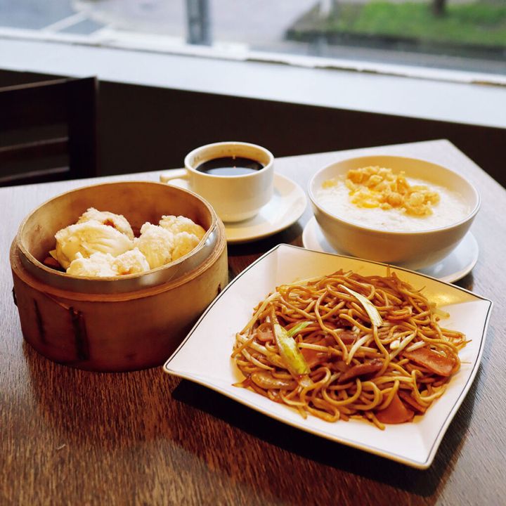 24時間営業ということもあり、ファミリーレストラン感覚で気軽に立ち寄れると人気の香港式飲茶レストランが、お得なモーニングメニューの提供を開始して話題になっている(平日朝7時〜10時半の時間限定)。お粥や麺といった朝にぴったりの主食をどれか一つ選ぶと、香港式の点心(+40元)、小菜(+15元)、飲み物(+10元〜)をそれぞれ一つずつ、通常の価格よりお得に組み合わせられるという内容(主食は単品でも注文可能)。写真のメニューは、手前から時計回りにハム、玉ネギ、モヤシが入ったシンプルなソース焼きそば「三絲炒油麺」75元、甘じょっぱいチャーシューまん40元、ホットコーヒー15元、卵と脂身の少ない牛肉が入った「滑蛋牛肉粥」85元。