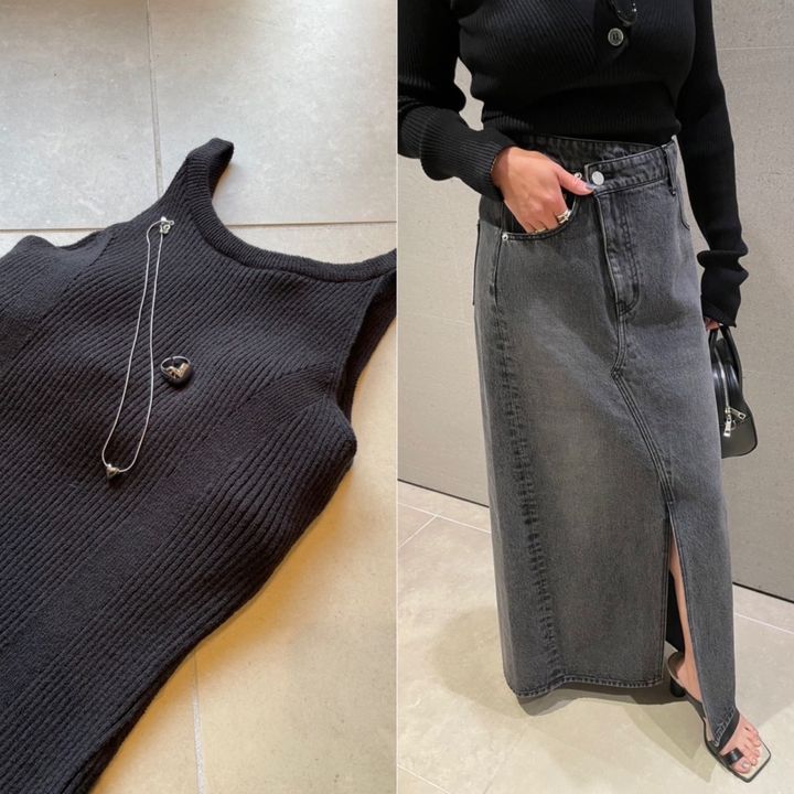 「カップインのアメスリトップスは気楽に着られるうえ、女性らしいシルエットが作れるオススメアイテム。ハートモチーフのリングとネックレスも“大人可愛い”をアクセントとして入れられるので気に入っています。デニムスカートはシルエットとウエストのアシメデザインが◎」アメスリニット¥13,970、デニムスカート¥23,100、ネックレス¥4,950、リング¥10,670(全てFRAY I.D/フレイ アイディー ルミネ新宿 2店)