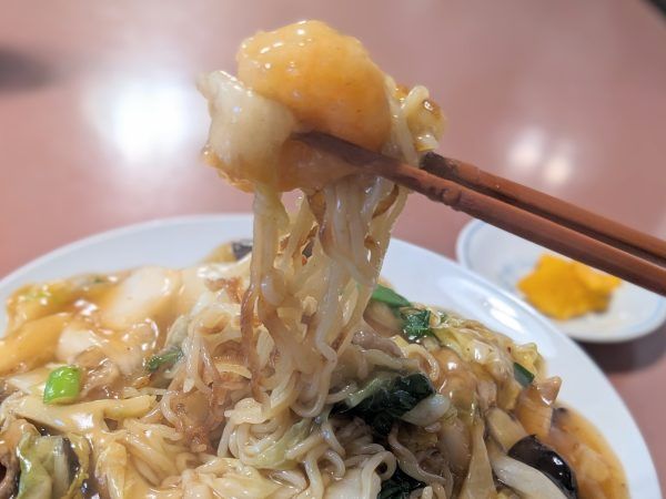 野菜たっぷりのあんの奥からやっと現れた焦がし麺。これがまた香ばしくて、あんを絡めて~美味しすぎて幸せ! ぷりっぷりの海老もひと手間かけて調理されていて美味しい〜。