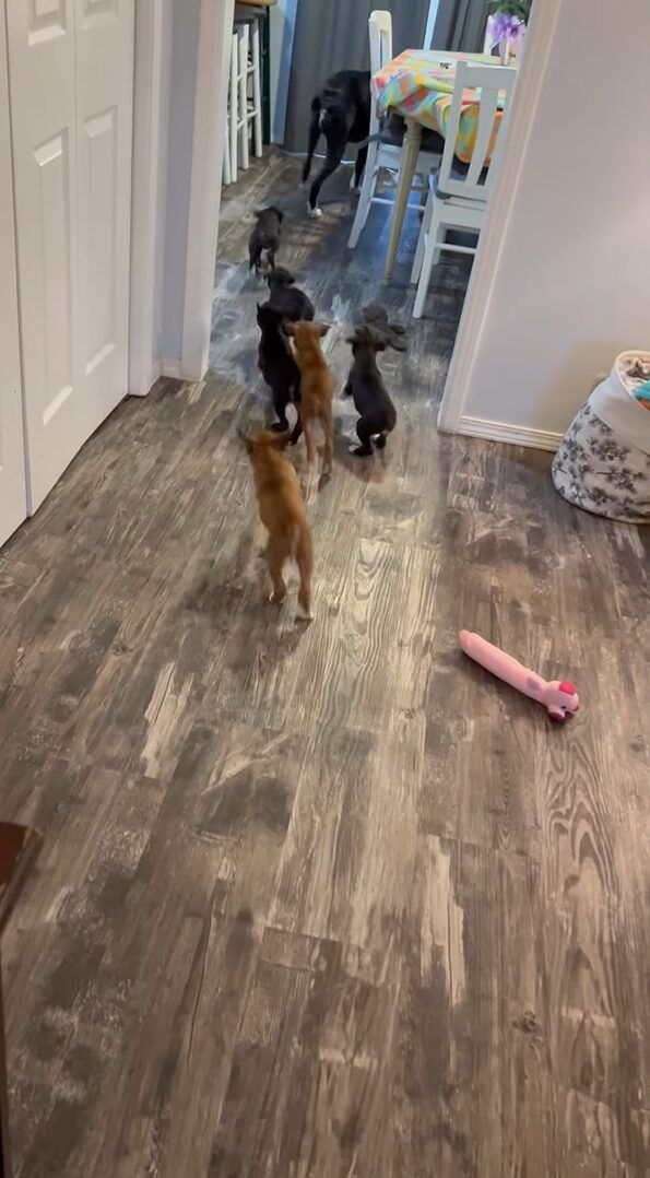 お家の中を元気に走り回るボクサーの子犬たち。みんなで楽しくパパを追いかけっこ!!【アメリカ・動画】