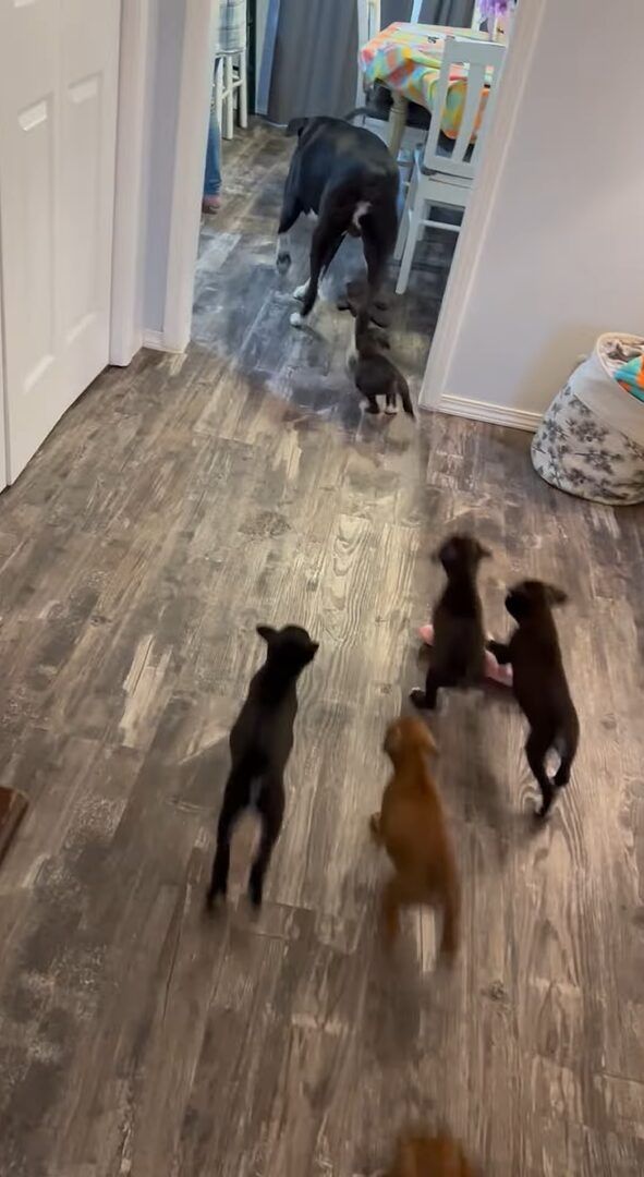 部屋の奥にいるクインに、生まれたばかりの子犬たちが向かっていきます。 パパのもとに向かおうとしているみたいです。