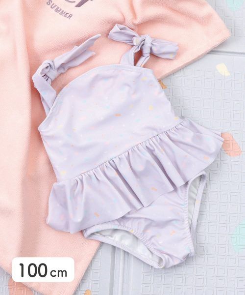 肩のリボンとフリルがかわいいワンピースタイプの水着です。80センチサイズも販売されています。