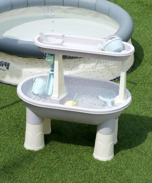 水遊びができるおもちゃがセットになったテーブルです。上段から水が流れてくるのが楽しい♪夏場のベランダ、庭遊びに。お風呂場でも遊べますね。