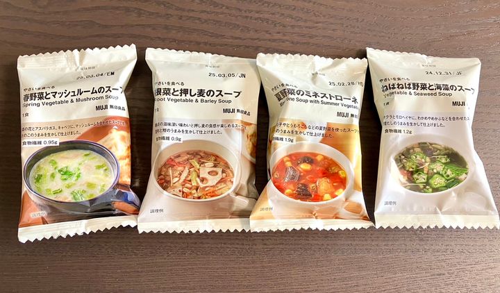 空腹に耐え切れなくなった時のために用意した、無印良品のスープたち。心強い仲間です。