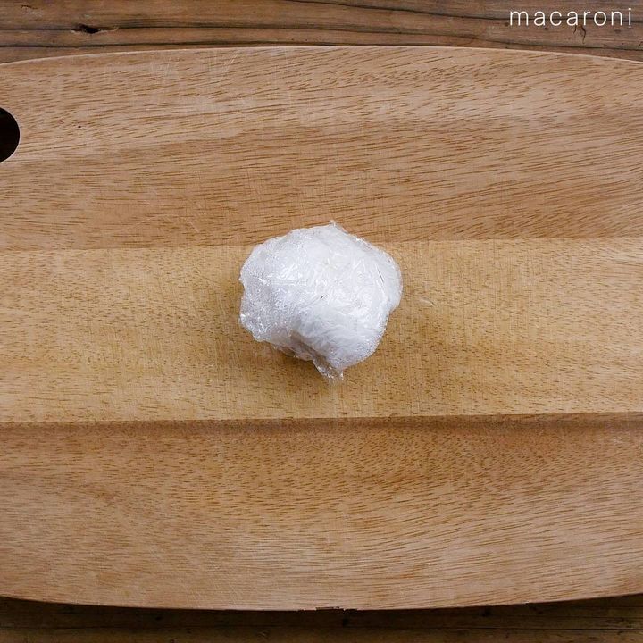 1: じゃがいもを濡れたキッチンペーパーとラップで包み、レンジ600Wで2分加熱します。取り出してラップに包んだまま粗熱を取ります。