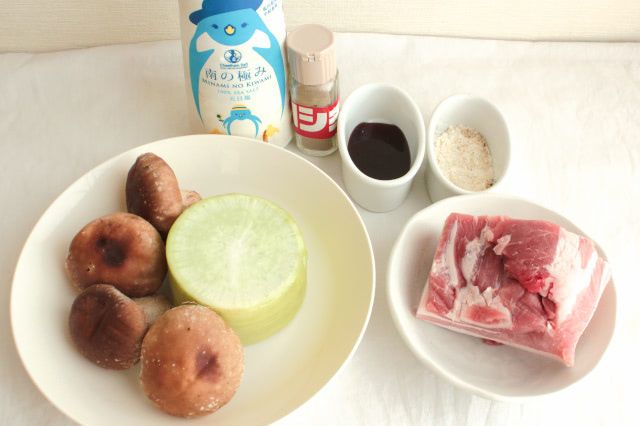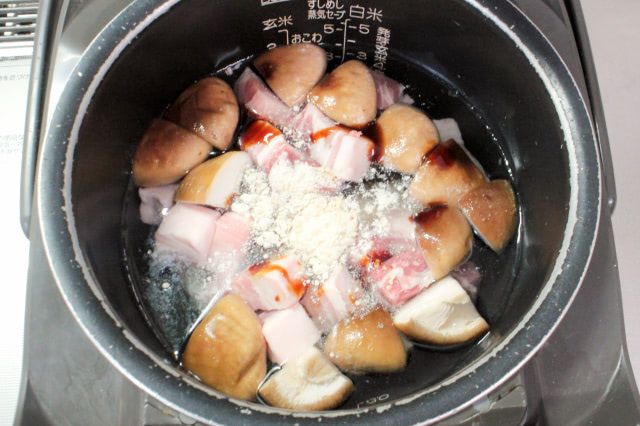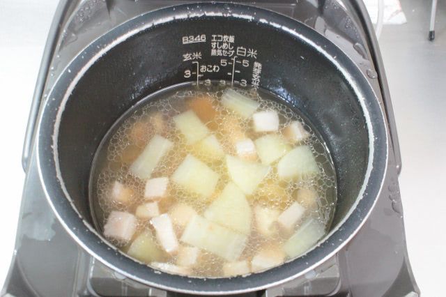 3. 大根、しいたけ、豚バラ肉を炊飯器に入れます。4合分の水、オイスターソース、鶏ガラスープの素も加え、普通モードで炊飯します。
