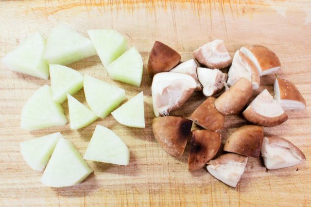 1. 皮を剥いた大根は、2cm厚さの輪切りにして6等分にカット。しいたけは軸を取って、4等分に切ります。