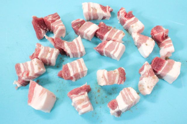 2. 豚バラブロック肉を約1.5cm幅にスライスしてから、それぞれ3等分に切って、塩とこしょうで下味を付けます。