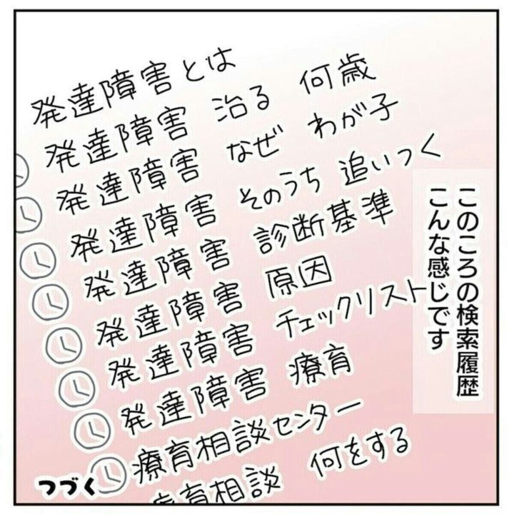 検索履歴が埋まってしまうほど、悩み結論を出すことがなかなかできなかった星河ばよさん。ですが、ソーシャルワーカーさんの後押しもあり、勇気を出して療育相談センターへ行くことにします。その結果、検査を受けた上で療育を受けられるようになりました。