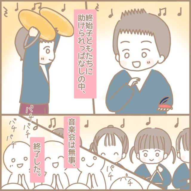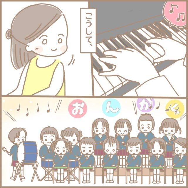 音楽発表会でピアノ伴奏をするまるちゃん先生は緊張で手が震えてきてしまいました。そんな時、子ども達が声をかけてくれたり手のひらに「人」の字を書いて気持ちを和らげてくれたのでした。