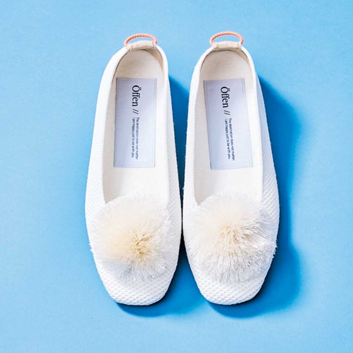 口コミを聞いて、ずっと狙っていたオッフェンのフラット。代官山店がオープンしたので、ポンポンがついた白を選びました。軽くて楽だし、足が大きめの人も困らないサイズ展開なのも嬉しいところ。