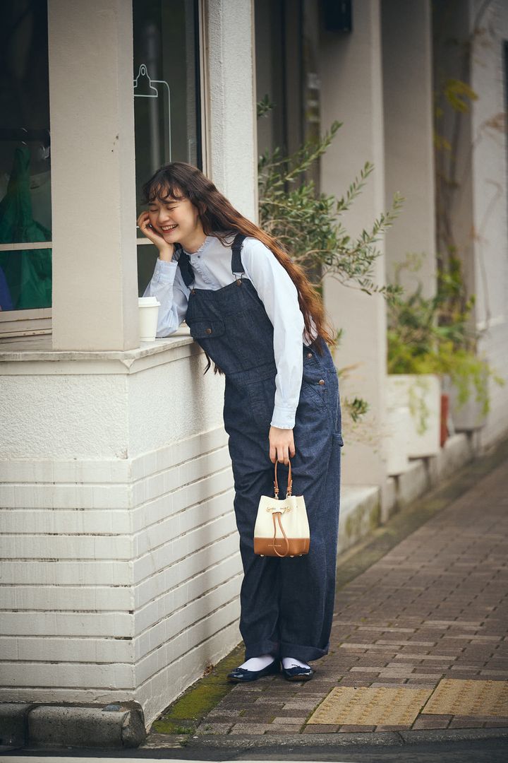 男の子っぽくなりがちなオーバーオールは、フリルのブラウスと組み合わせて、甘さをプラスするのが大事。ブルーの色味でまとめれば、上品に着こなせるのです。《BLUE BLUE》のオーバーオールは薄手の生地なので、春から夏にかけてもデイリーユースできのも嬉しい。小ぶりなバッグとフラットシューズのレディな小物でまとめて。