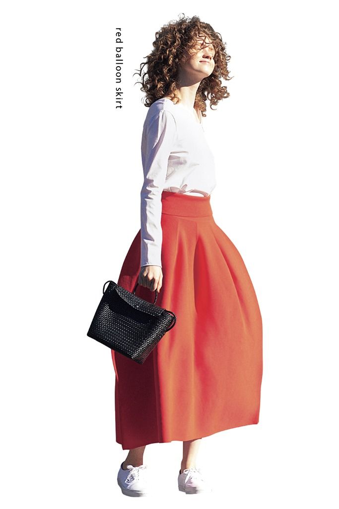 デコルテのあいたカットソーに、鮮やかな赤のロングスカート。レディな上下にモードをもたらす、ハリのあるニットのふくらみ。目の詰まった素材ゆえの、ほどよい重み。