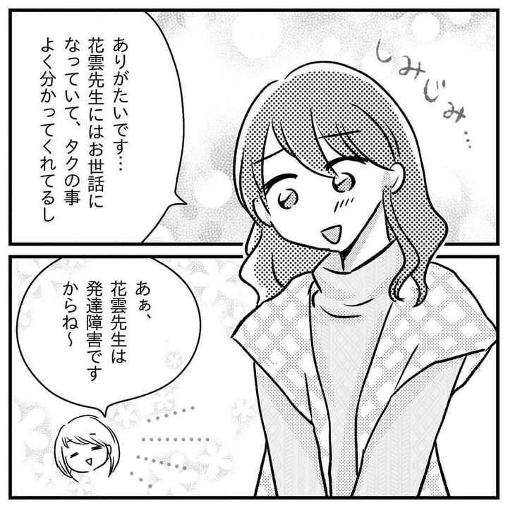 もっつんさんはさまざまな葛藤を乗り越え、ありのままの我が子を受け入れる覚悟を決めました。一番近くに自分を理解してくれる味方がいるからこそ、タクくんは安心して成長できるのですね。