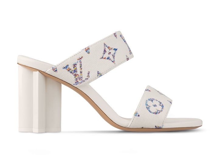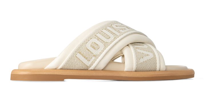 「Louis Vuitton」シグネチャーをプリントしたキャンバス製のクロスオーバーストラップを2本あしらい、リラックスしたスタイルに仕上げた「LV ブリス・ライン ミュール」。