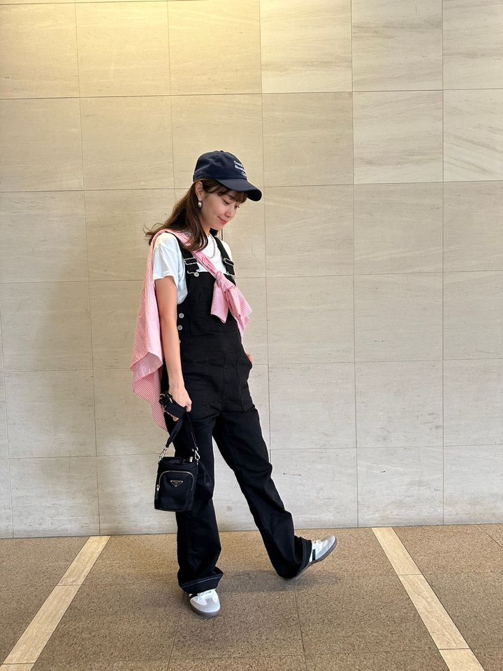 bag/PRADA tops&cap/SEA shirt/Mila Owen overalls/SOMETHING✖️F by ROSSO sneakers/adidas Originals