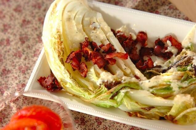 白菜とベーコンの組み合わせの中でもっともダイナミックな一品がこちらの焼き白菜。下に敷いたベーコンの塩気がちょうどよく、焼いた白菜の甘みを引き出します。レシピでは卵黄とマヨネーズのソースで食べますが、卵がないときはマヨネーズだけでもおいしく食べられます。