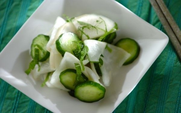 みずみずしいキュウリとカブの浅漬けは暑い日の箸休めにイチオシ! 砂糖と塩のみのシンプルな味つけで、仕上げに刻んだ大葉を加えるのがポイントです。前日の夜に作り置きしておけば、朝ごはんのおともにも。