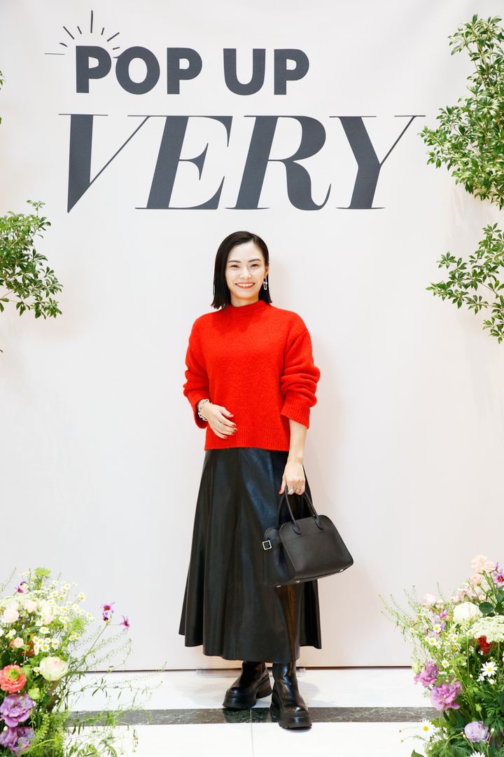 「今日はテンションの上がる赤いニットを主役に、ほかはブラックでまとめてボリュームのあるジュエリーをプラス。ピアスとブレスレットはティファニーのハードウェアシリーズで統一しました。付けるだけで存在感が出るのと、一気に華やかさが増すのでどんなコーデのときにも頼りっぱなしです。欲しいジュエリーが見つかったらVERYを見てコーディネートのイメージをしたり、インスタを参考にしてしています」稲垣摩耶さん・会社員(156㎝/5歳と6歳と9歳の男の子ママ)