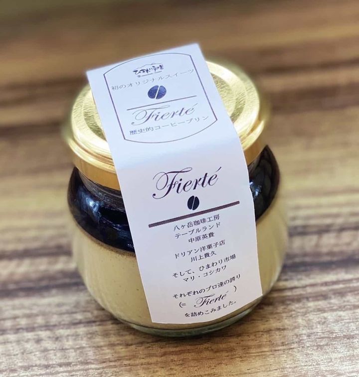 「歴史的コーヒープリン fierte(フィエルテ)」は、山梨県・ひまわり市場初のオリジナルスイーツ。元銀座のパティシエールだったスイーツ担当のマリ・コシカワが開発した香り高い大人のコーヒープリンです。ドリアン洋菓子店の絶品プリンの上に、テーブルランド「ひまわり市場オリジナルブレンド」で作ったコーヒーゼリーを重ねています。
