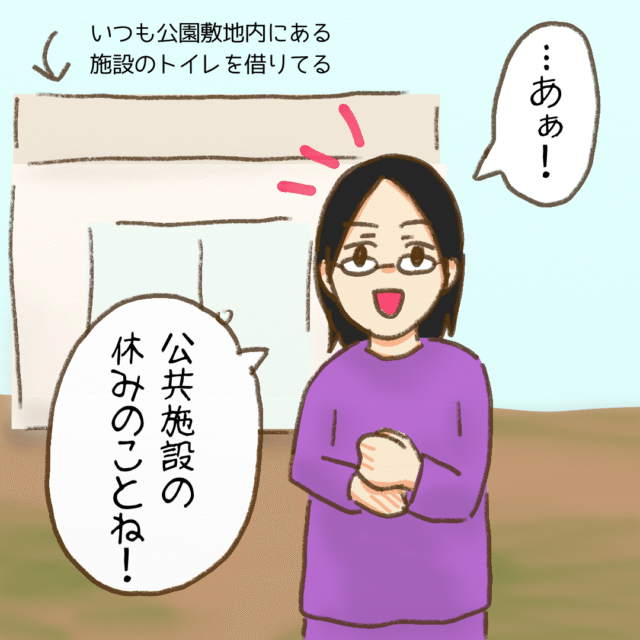 あぁ~!公共施設が休みでトイレに入れるかどうかって事か!(理解)