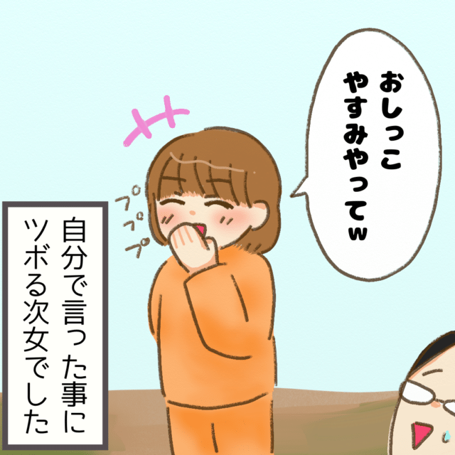 あはは!時間が経つにつれジワジワ面白く思えてくるパターンですね(笑)自分の言ったことにツボる次女ちゃん、可愛いです!