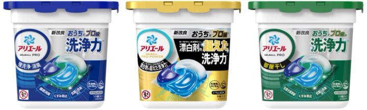 新しい「アリエール ジェルボール プロ」は、使う人のニーズに合わせて、王道のブルー・さらに高い洗浄力のゴールド・部屋干し用のグリーンの3種類のラインアップで発売中。