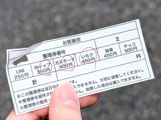 UNI DONUTSでは、毎日11時から整理券を配布しています。注文も整理券の受け取りと同時です、各種1個ずつと購入制限があります。整理券の有効期限は当日の12時~14時まで。過ぎてしまうと無効になってしまうとのこと。