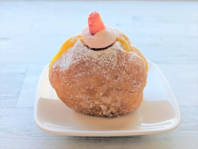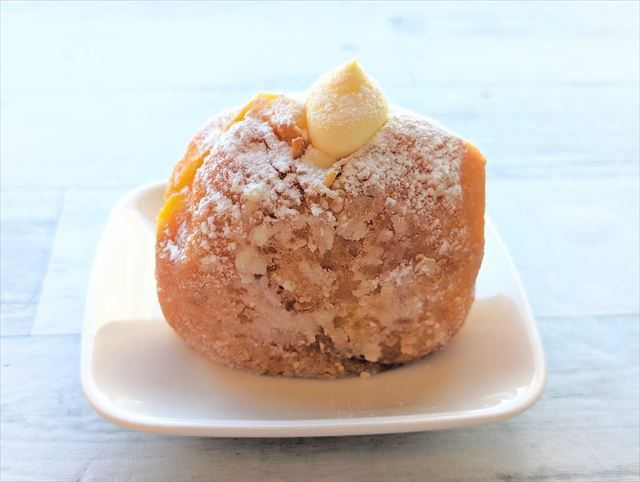 次に「カスタードドーナツ」。カスタードに生クリームが合わさっています。まず一番に感じたのが重量感……! 一番ずっしりしています。