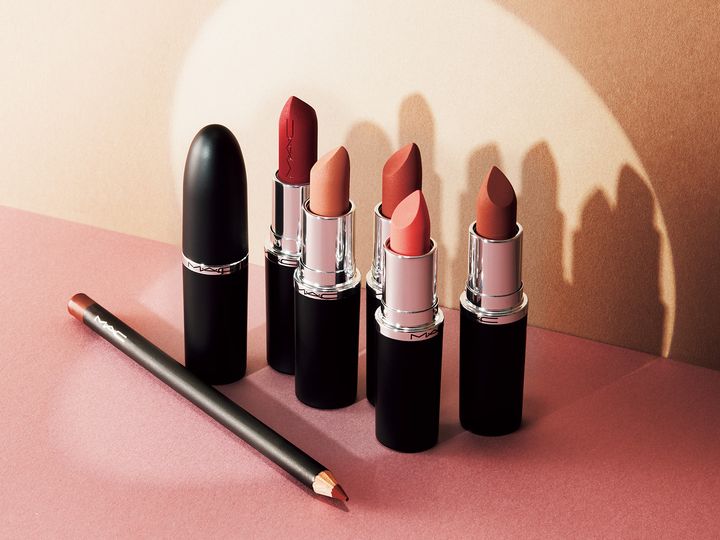 左から:’90年代のベージュメークを象徴する世界的ヒット作。著名人の愛用者やダース買いするプロも。リップペンシルスパイス¥3,630、真骨頂のリップがさらなる高みへ。色を番号ではなく名前で呼ぶのも個性を重んじるM・A・Cらしさ。使う人を選ばないスキントーン。マキシマルシルキーマットリップスティックウォームテディ、マドンナがツアーで使用し話題になったという色。同ロシアンレッド、ベージュピンクのパイオニア的カラー。同ハニーラブ、肌色に映えるピーチブラウンは、特にアジア地域で人気の色。同マルイットトゥザマックス、ブランド創設のきっかけとなった伝説の色が復活。同フラミンゴ、すべて¥4,620