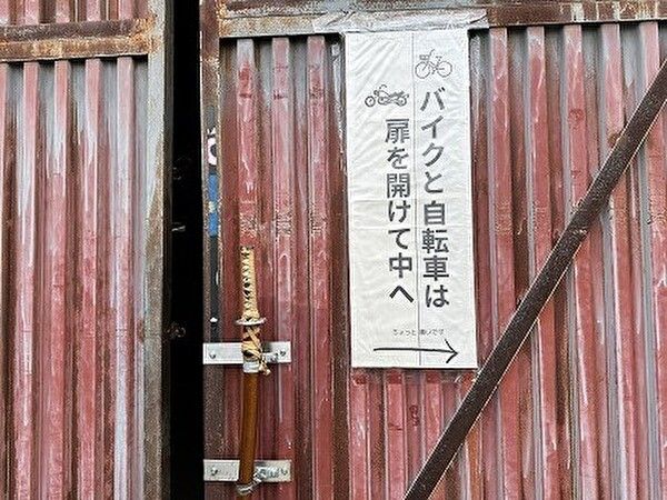 よく見ると、刀が取っ手になっています。少し重いドアを開けます。バイクや自転車も中に入れてください。